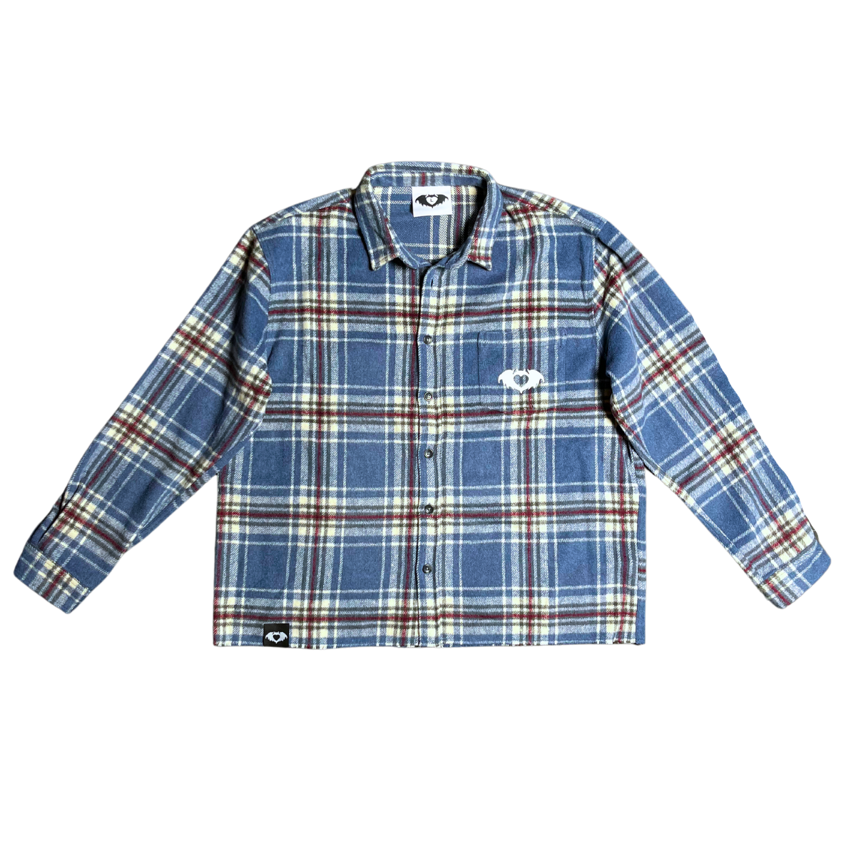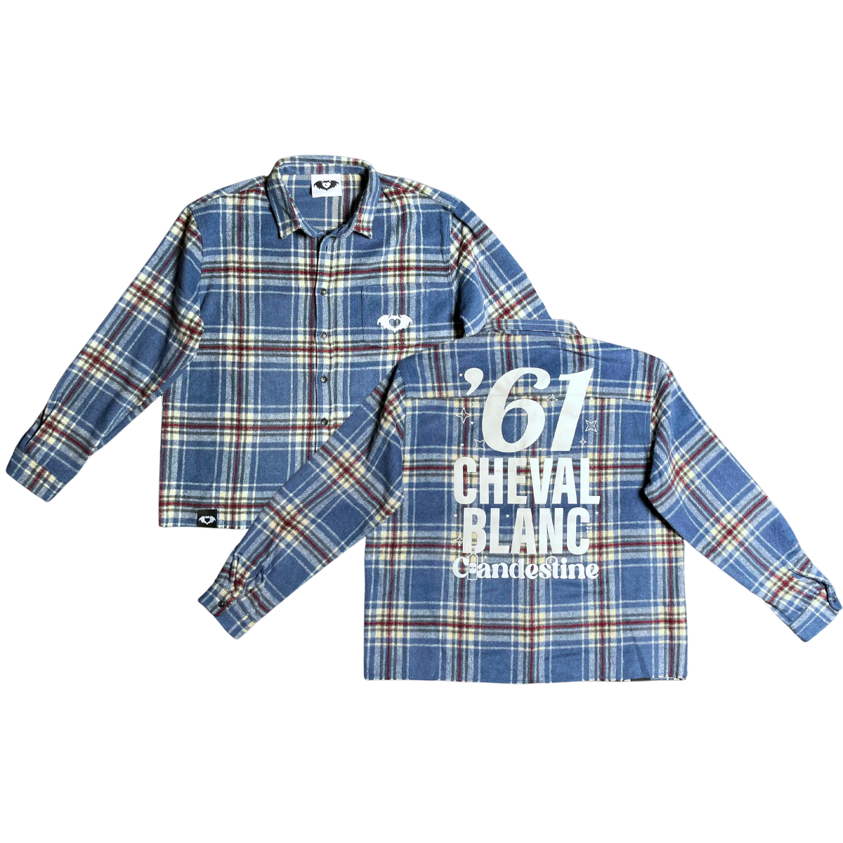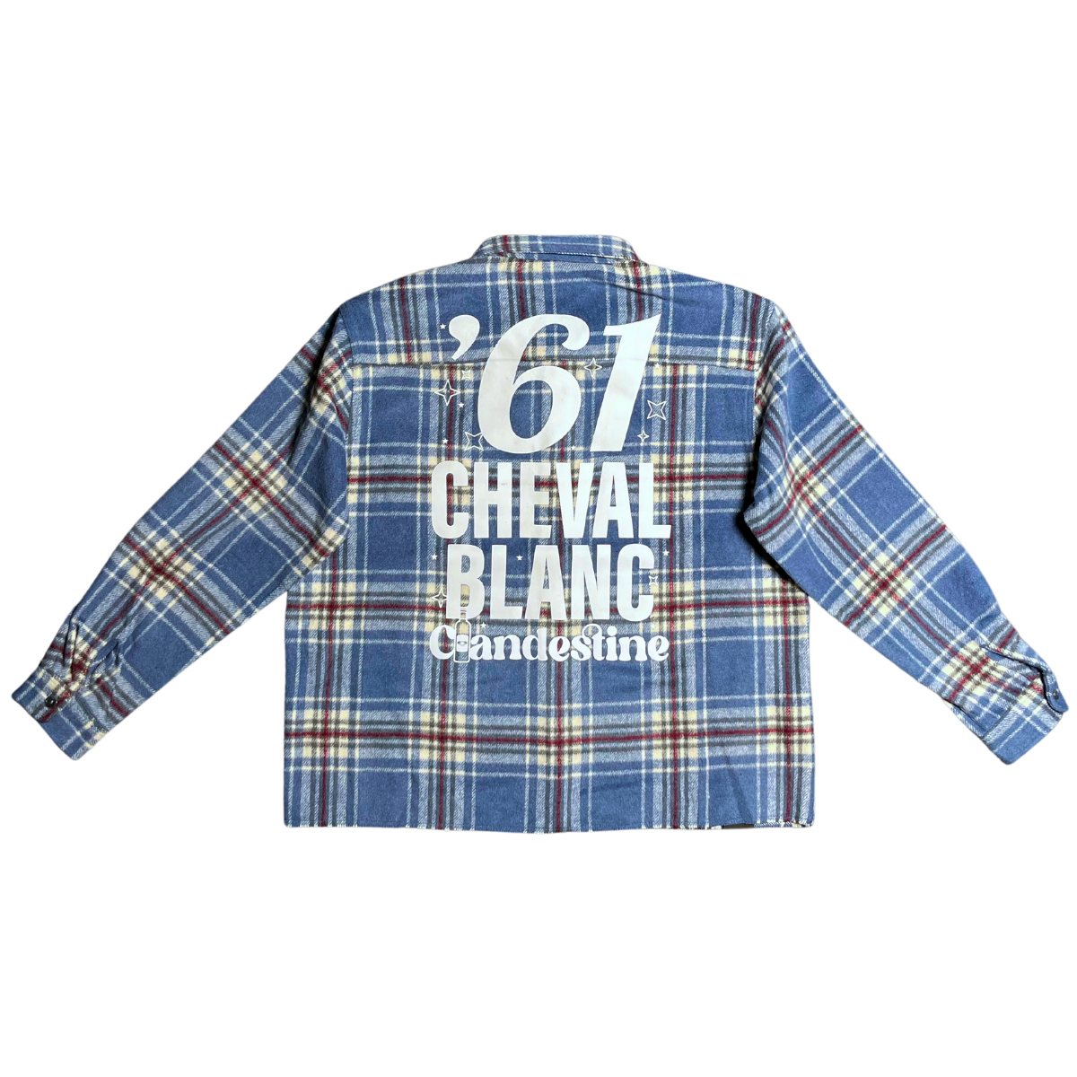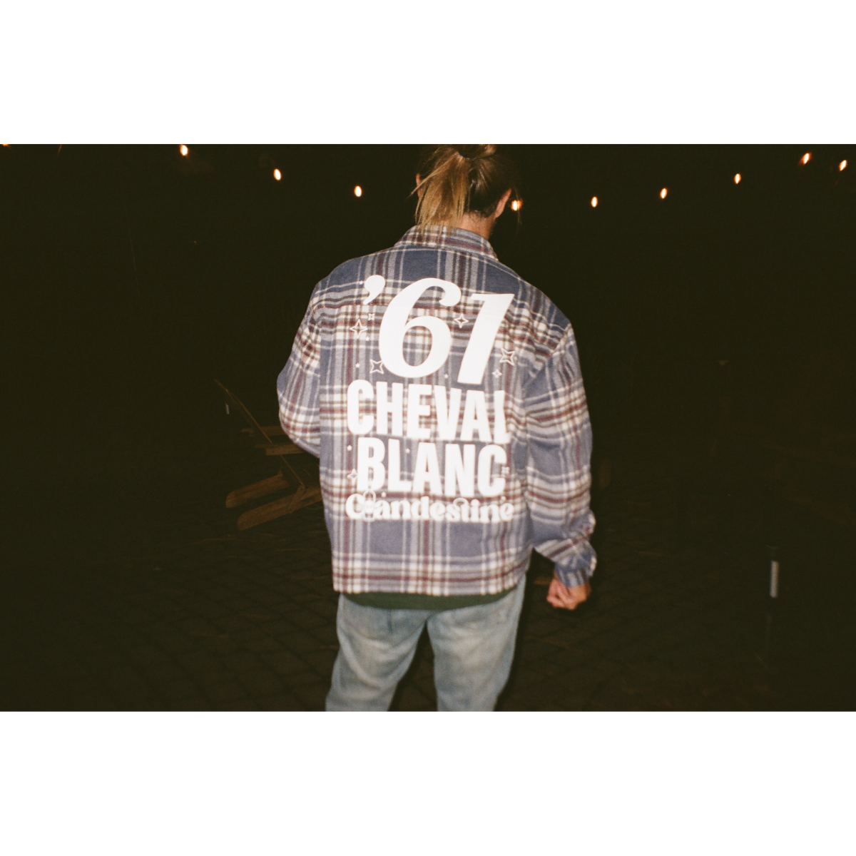 100% cotton faded flannel with rawcut hem. Front button closure, buttoned cuffs, and chest pocket. White Clandestine logo on front pocket and white '61 Cheval Blanc jumbo print on back.