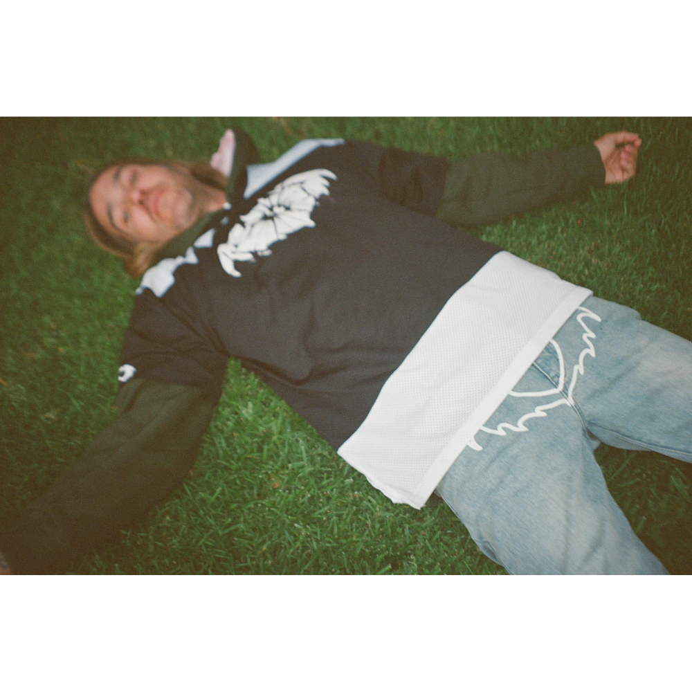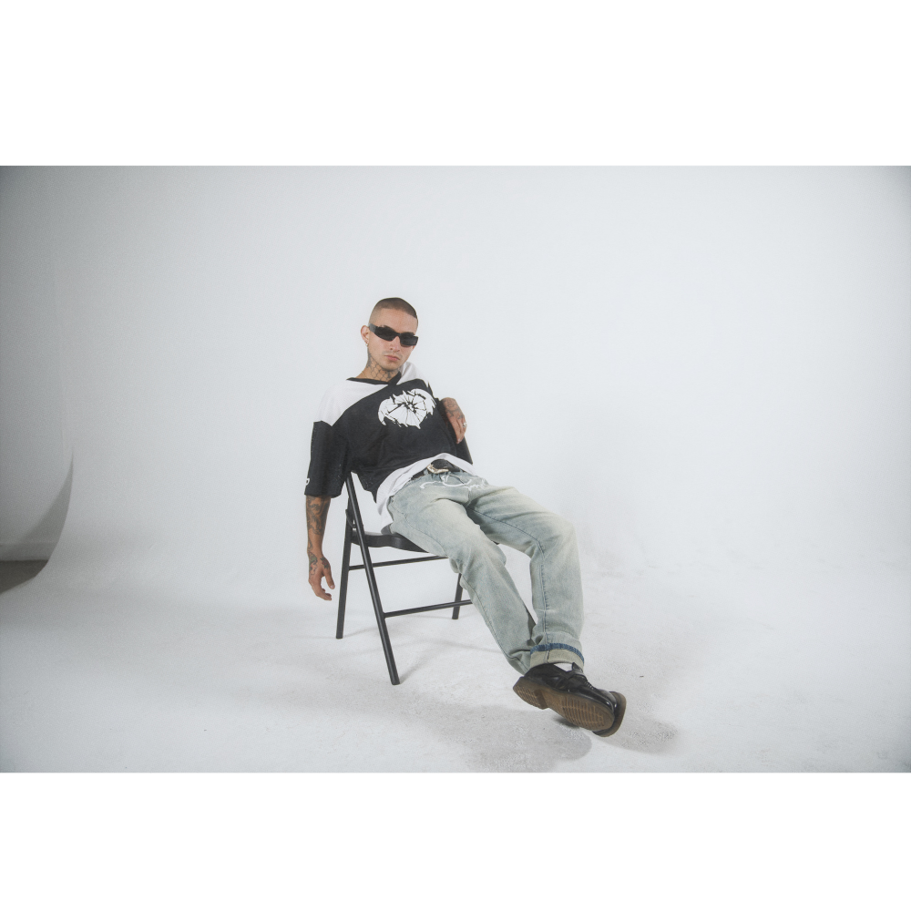 Light wash slim-fit denim pants with white Clandestine logo on front. Slim tapered fit with a low rise in the front and higher rise in the back.