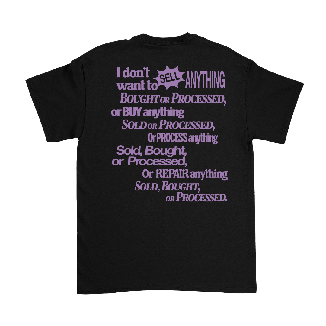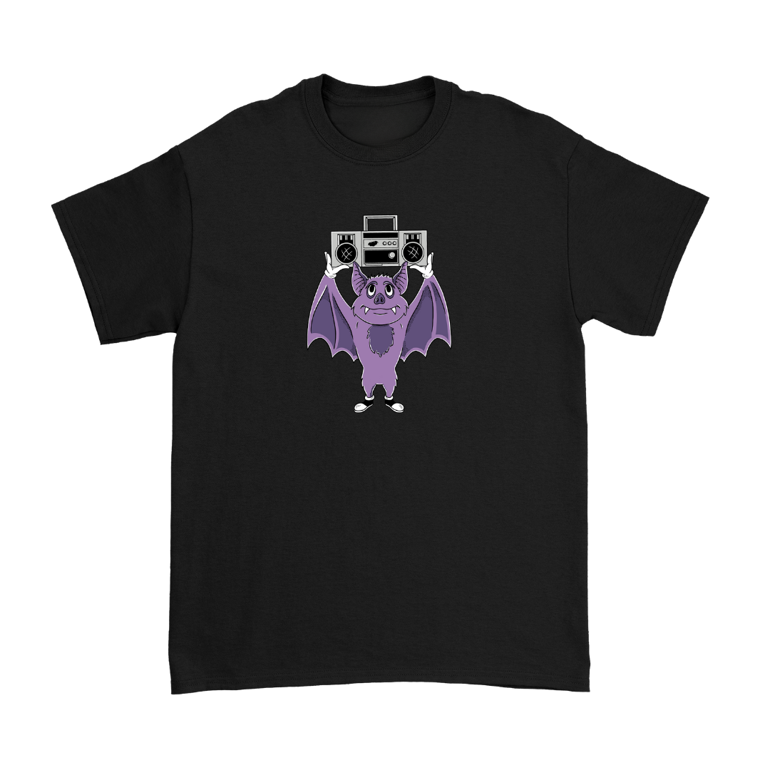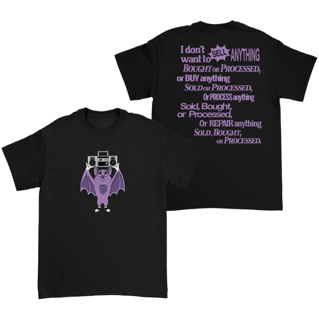 100% cotton unisex t-shirt with a classic fit. Purple bat with boombox design on front, 'sell anything' passage on back.