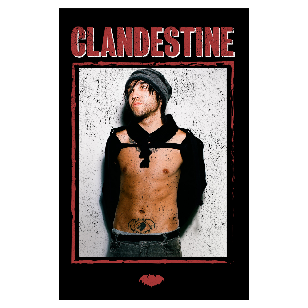 Premium 100% cotton black unisex t-shirt with a relaxed fit. Features Pete Wentz "Clandestine" artwork on front.