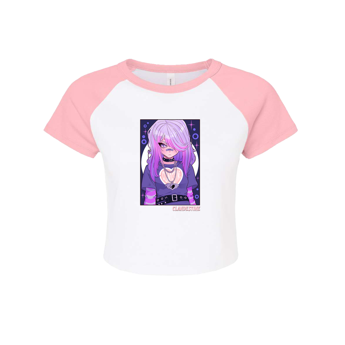Pre-shrunk 52% airlume combed and 48% ring-spun cotton/polyester fitted pink and white duo tone crop top. Purple anime artwork on front.